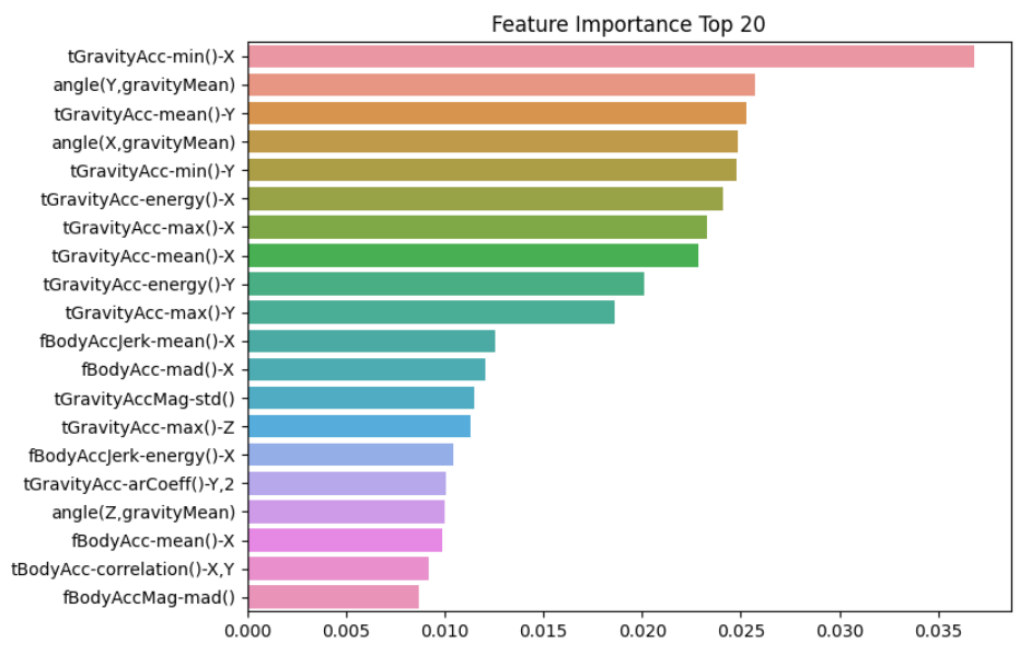 위 결과를 보면 행동 인식에는 중력가속도 센서가 Body 센서에 비해 상대적으로 더 중요하다는 것이다.